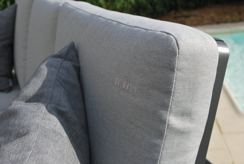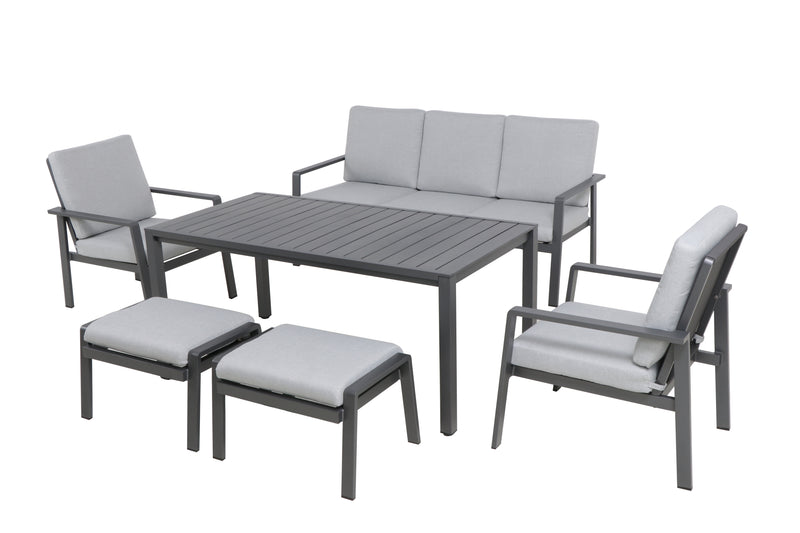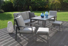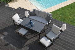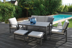 Dining mit Lounge-Charakter: das sechsteilige Low-Dining Set Atlantico zeichnet sich durch bequemen Sitzkomfort aus, kombiniert mit optimal abgestimmter Sitz- und Tischhöhe. So kann das Set sowohl zum Enspannen, als auch zum geselligen Beisammensitzen und zum Essen vielseitig genutzt werden. Armlehnen und passende Sitz- und Rückenauflagen mit abnehmbarem Bezug sorgen für praktische Wohnlichkeit im Freien - den ganzen Tag.