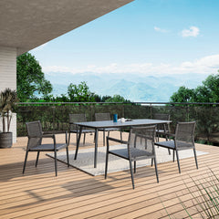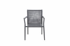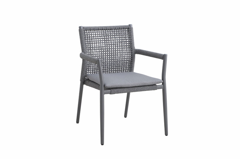 Die Ropero-Serie zeichnet sich durch ihre elegant zulaufenden Beine an Stühlen, Sesseln, Sofas und Tischen aus. Der einzigartige Materialmix der Sitzmöbel zeigt den Kontrast zwischen textilen Materialien und Aluminium. Armlehnen, Sitzrahmen und Rückenlehne sind mit Seilen bespannt. Dank der Bespannung bietet die Rückenlehne eine luftige, flexible Fläche zum Anlehnen. Textile graue Sitzpolster runden die Serie in puncto Optik und Komfort ab.
