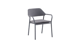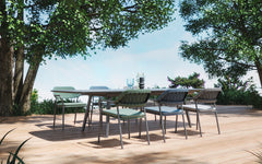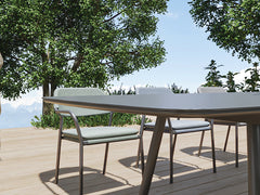Their bend, as well as armrests and colour-coordinated seat cushions, ensure pleasant seating comfort. Matching tables for dining chairs and as part of the lounge set complete the stylish series.