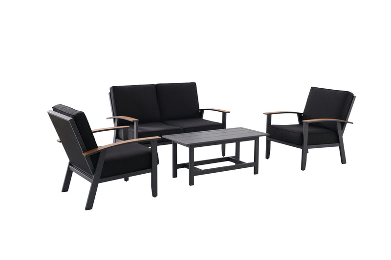 4-part, aluminium frame with textiles, removable cushions, aluminium table with wood-look table top
