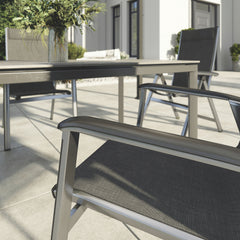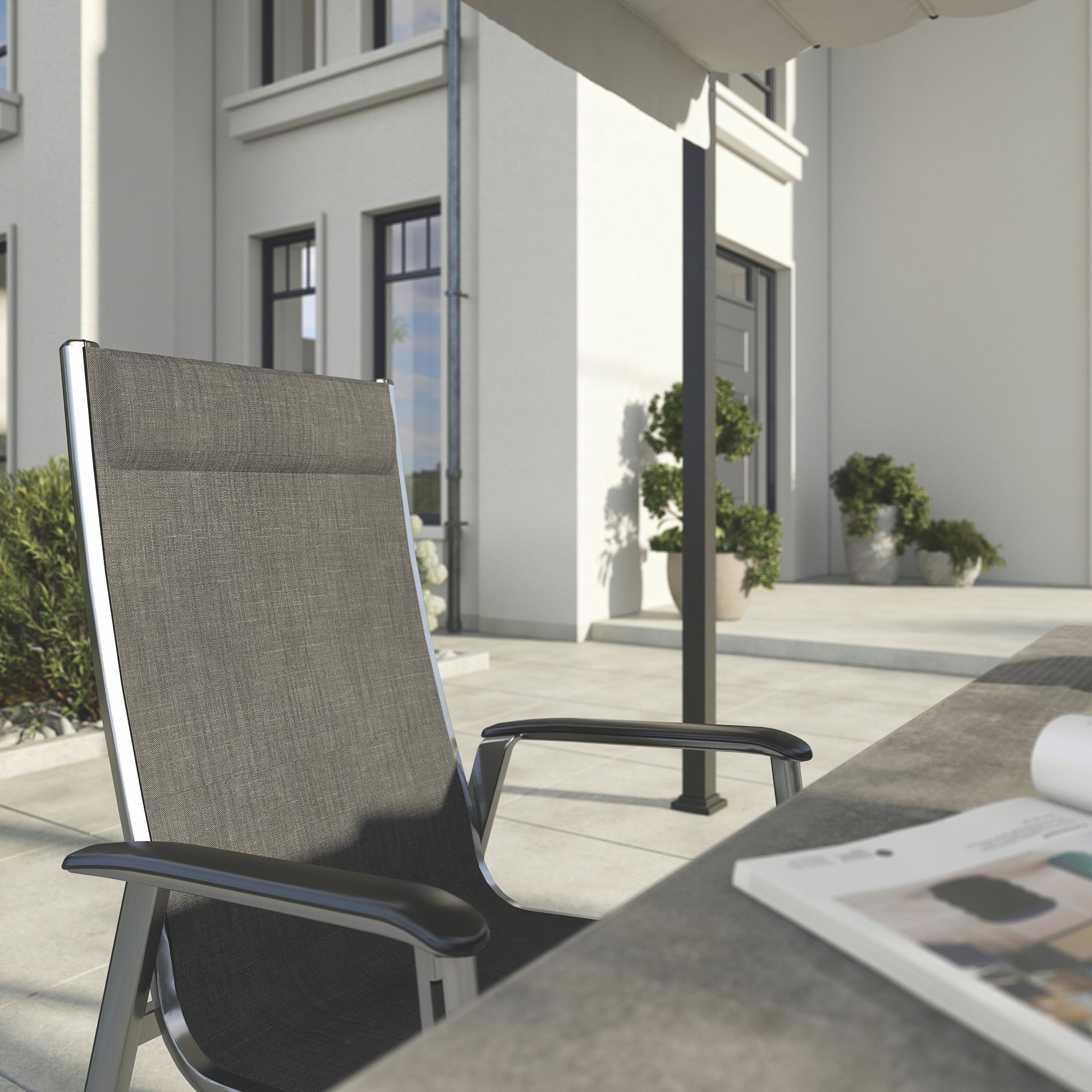 Aluminium Stacking Chair, seat made of Textilene with integrated dry foam head upholstery.