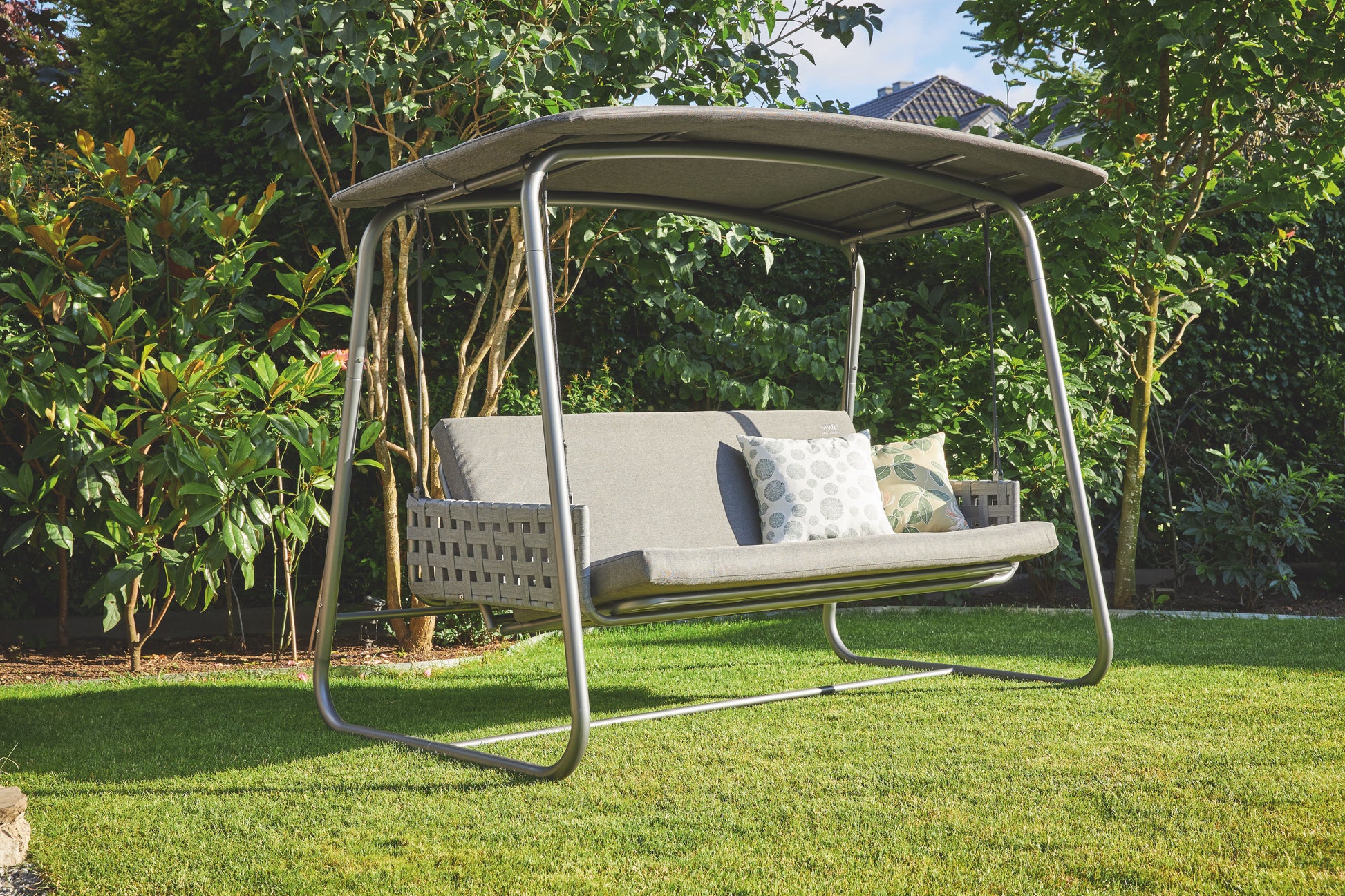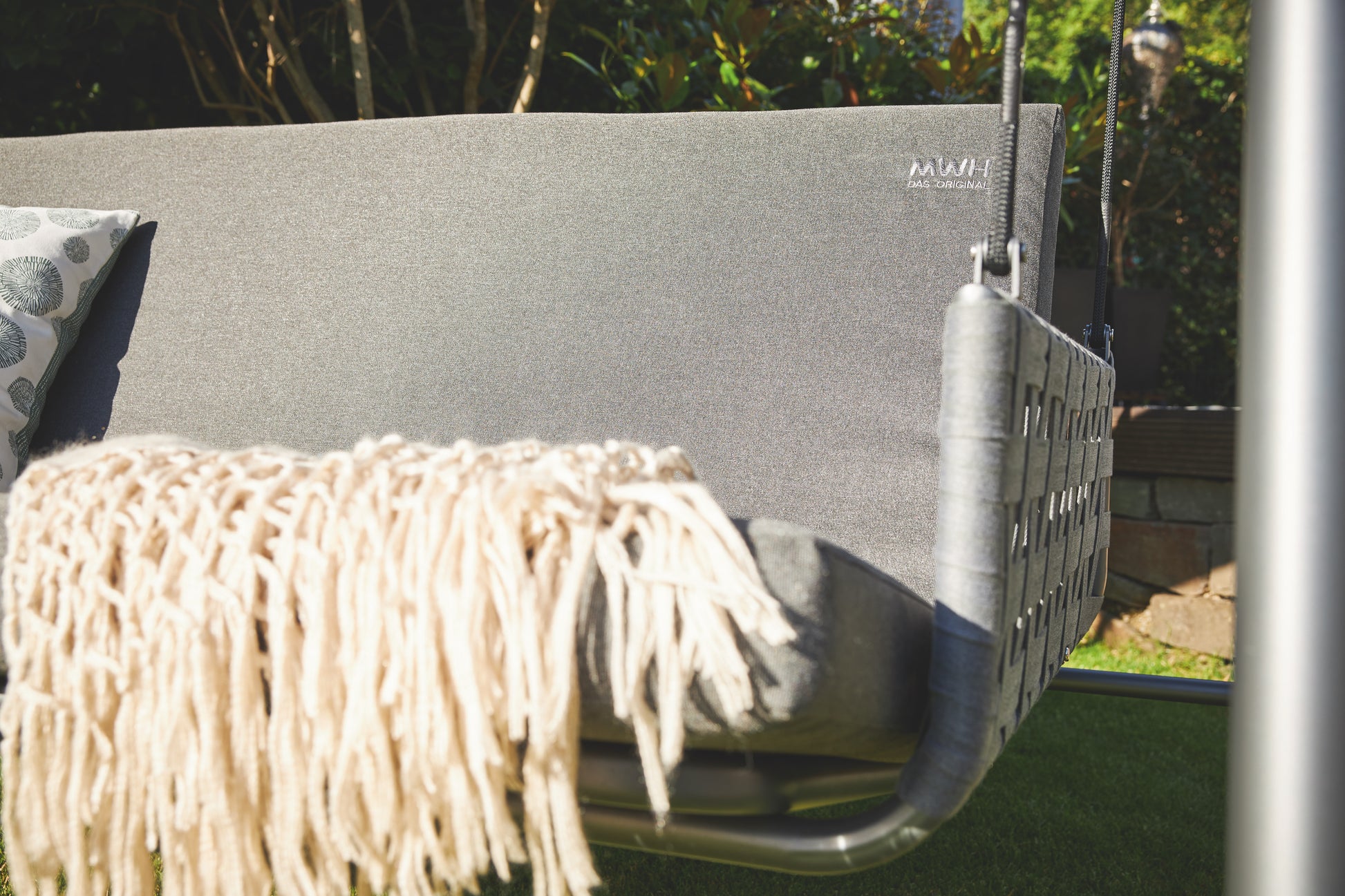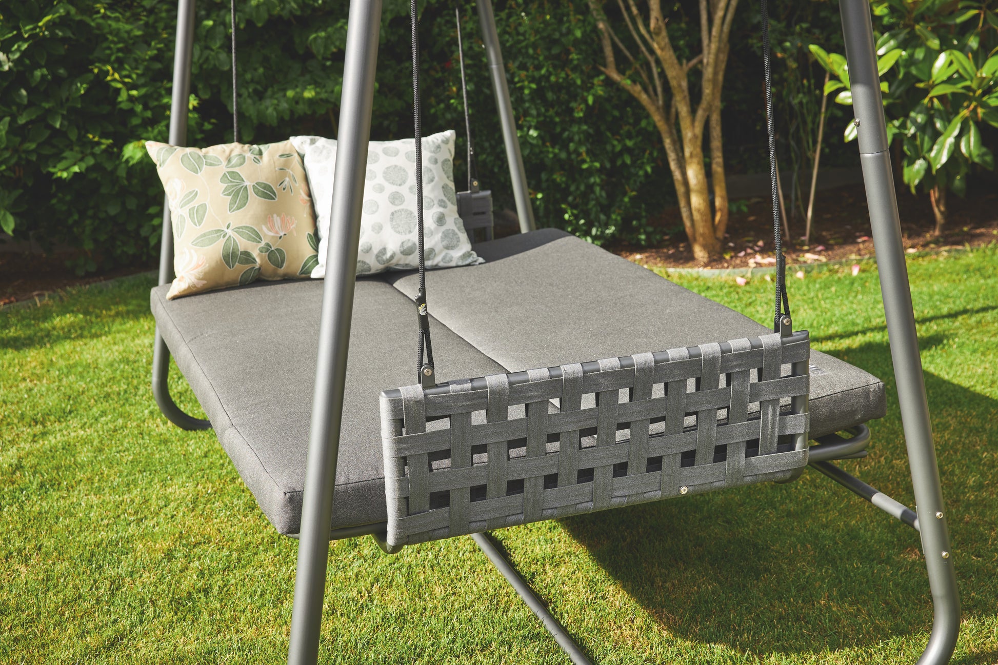 Stylish and inviting to relax, the Hollywood swing Crossado blends into its natural surroundings. The frame discreetly gives way visually to the modern, coarse-banded wickerwork with a natural look and feel. The soft cushions in stone-colored light grey also create a natural look. The Hollywood swing is weather resistant and easy to clean. A dream for any garden or terrace.