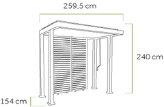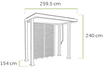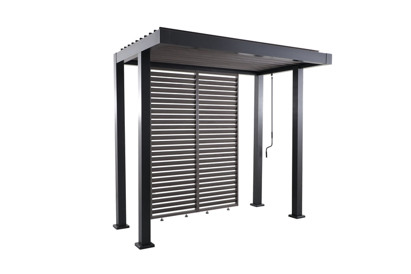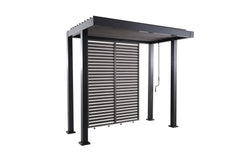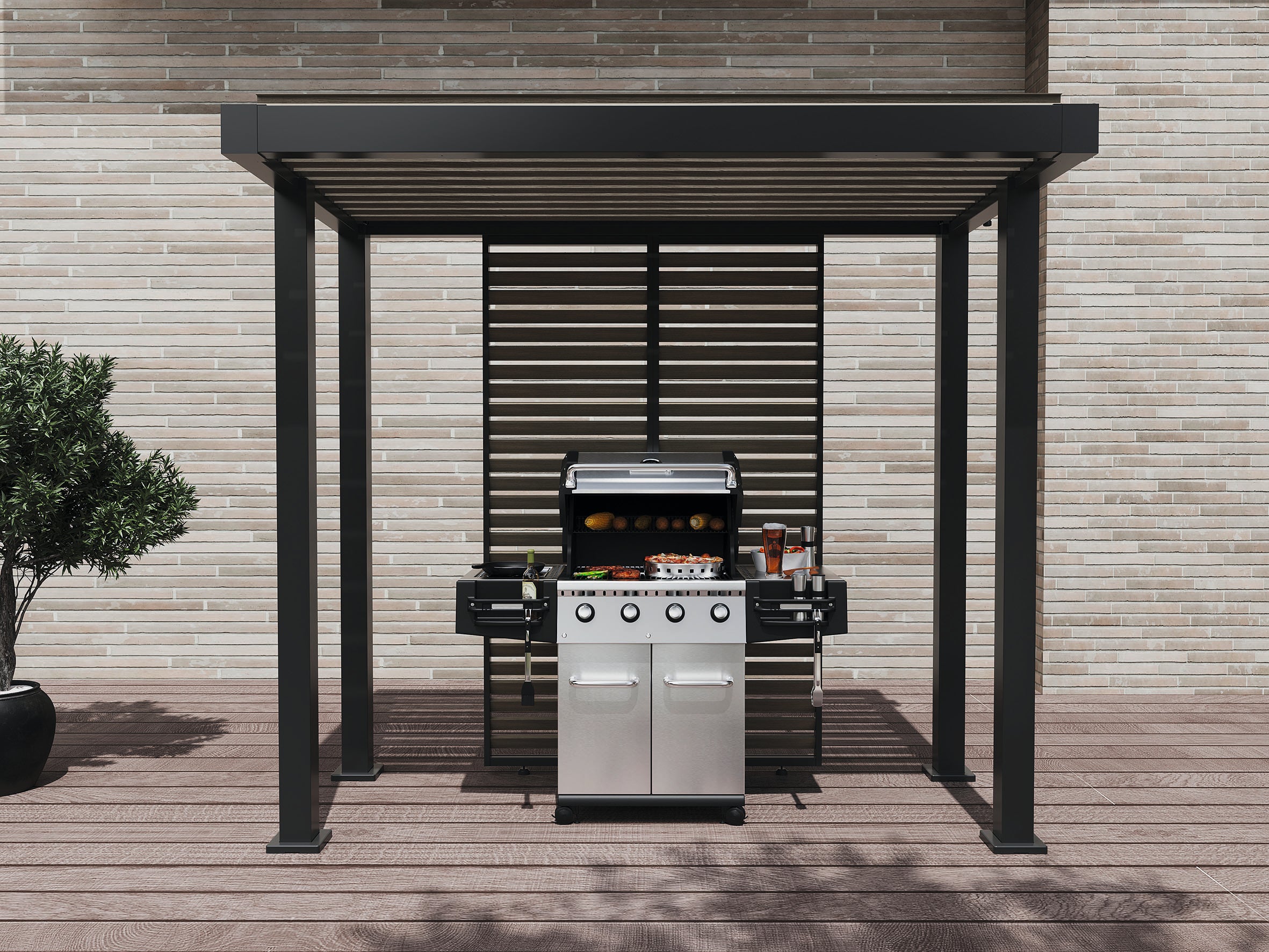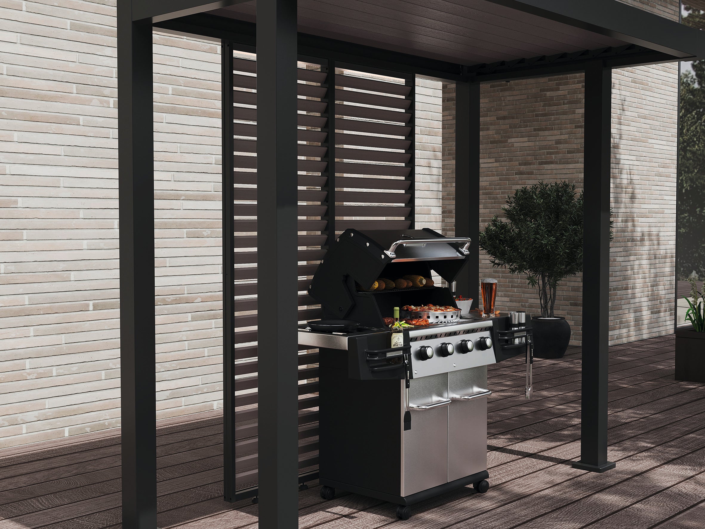 The ‘Grillzebo’ barbecue pavilion is made of robust aluminium and has an air-permeable slatted wall. This ensures that the barbecue vapours from the gas barbecue can easily escape from all sides. The roof consists of roof slats that can be adjusted with a hand crank and can provide protection from the sun or light rain. The roof and rear wall slats coated in a modern wood look using the thermal transfer process are a visual highlight.