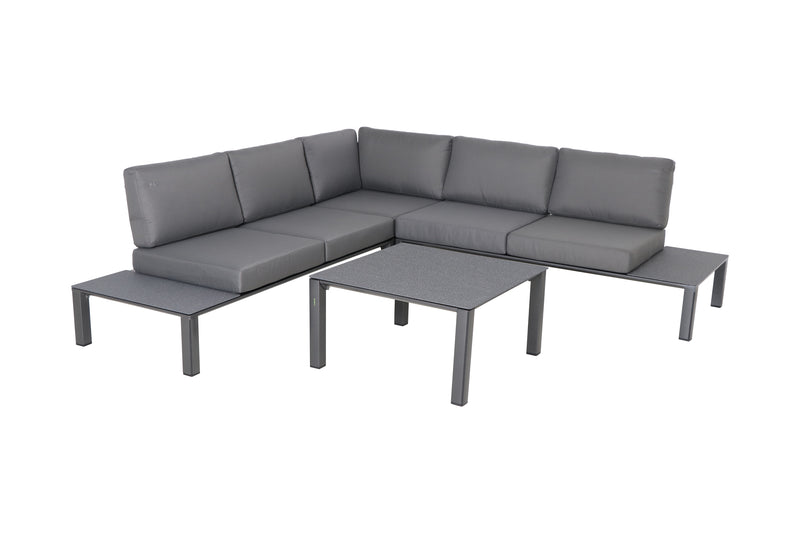 2 two-seater sofas with attached side tables and one corner element and one square coffee table with coated glass tabletop