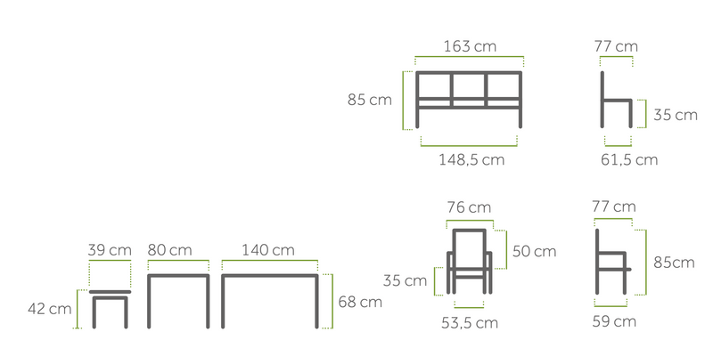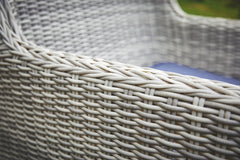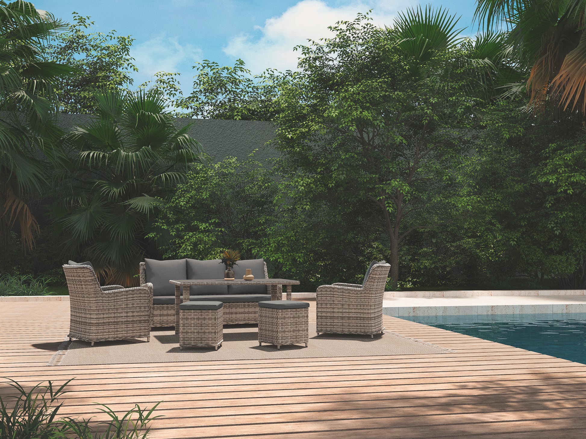 Woven comfort - Lodrino invites you to stay - to eat or just sit together. The compact wicker furniture made of polyrattan has a high-quality finish and is weather-resistant. The included outdoor cushions provide the necessary comfort. The wicker furniture set consists of two arm- chairs, two stools, a 3-seater sofa and a table.