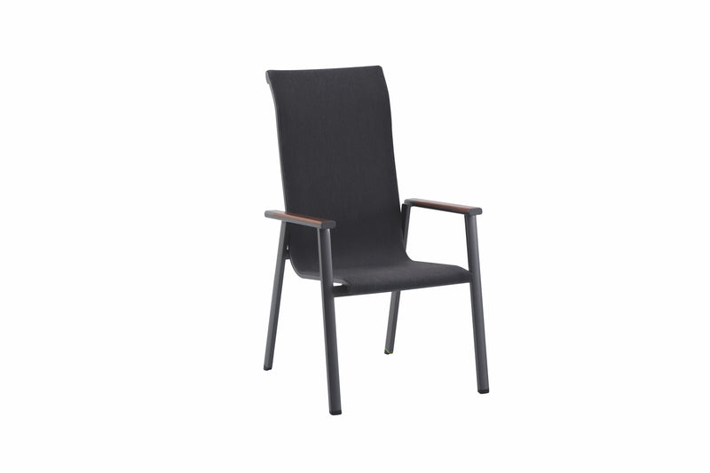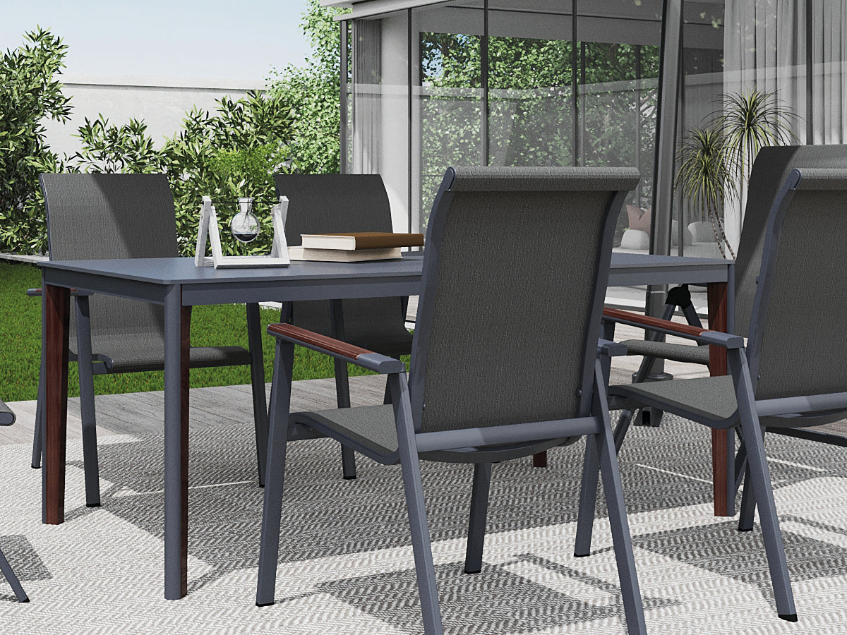 The Prado series includes a Stacking Chair, a Multiposition Chair, a dining table as well as an armchair and a sofa group consisting of two 2-seater sofas and two tables. All pieces are characterised by elegant design elements: the ends of the seat and backrests are rolled up, which gives a stylish look and adds to the seating comfort. In addition, all Prado furniture includes elements and armrests in a luxurious mahogany look.