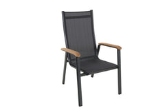Comfortable garden furniture series Reno stands for functional comfort in the outdoor area. Both the lightweight Aluminium frame and the sturdy Textilene defy wind and weather. The armrests, made from FSC®-certified Teak, create a beautiful combination of the modern durable materials and the natural environment in your garden.
