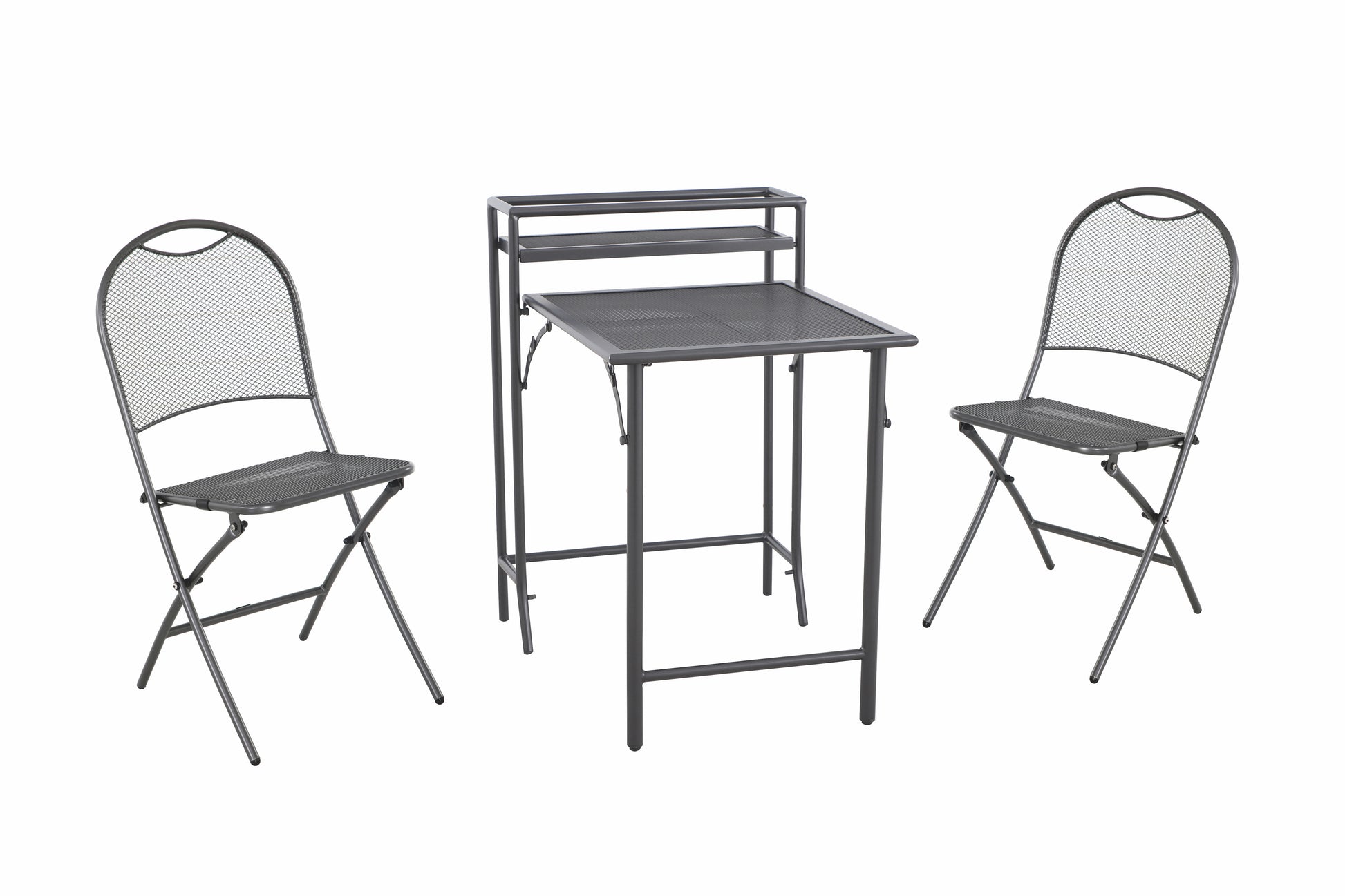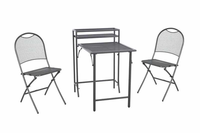 Expanded metal balcony set consisting of two folding chairs with rounded back and folding table with rectangular tabletop and holder for flower pots.