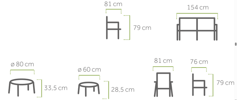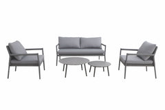 The Ropero series is characterized by its elegantly tapering legs on chairs, armchairs, sofas and tables. The unique material mix of the seating furniture shows the contrast between textile materials and Aluminium. Armrests, the frame of the seat and the backrest are covered with ropes. Thanks to the covering, the backrest offers an airy, flexible surface to lean against. Textile grey seat cushions complete the five-piece sofa set in terms of appearance and comfort.